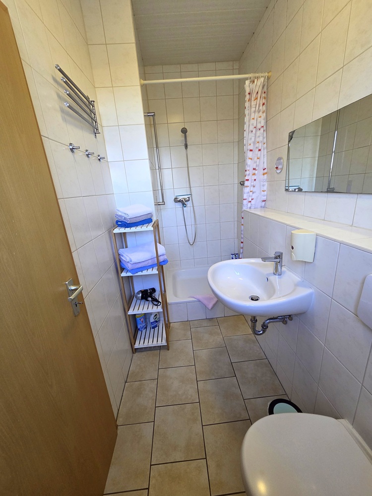 Im Bad mit Dusche, gibt es ein Waschbecken, WC und sogar ein Fenster.