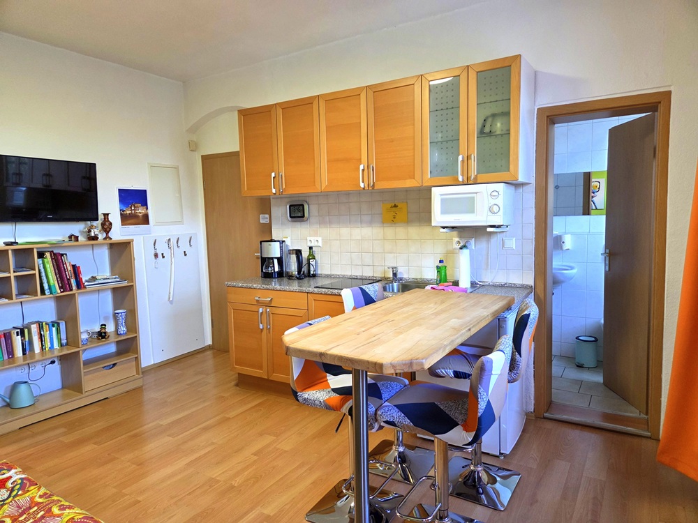 Der Wohnraum zeichnet sich durch kurze Wege zur Küchenzeile mit Kühlschrank, zwei Elektro-Kochplatten, Spüle, Wasserkocher, Kaffeemaschine, Toaster und Mikrowelle und ein Doppelbettsofa (1,60 x 2,00 m) aus.